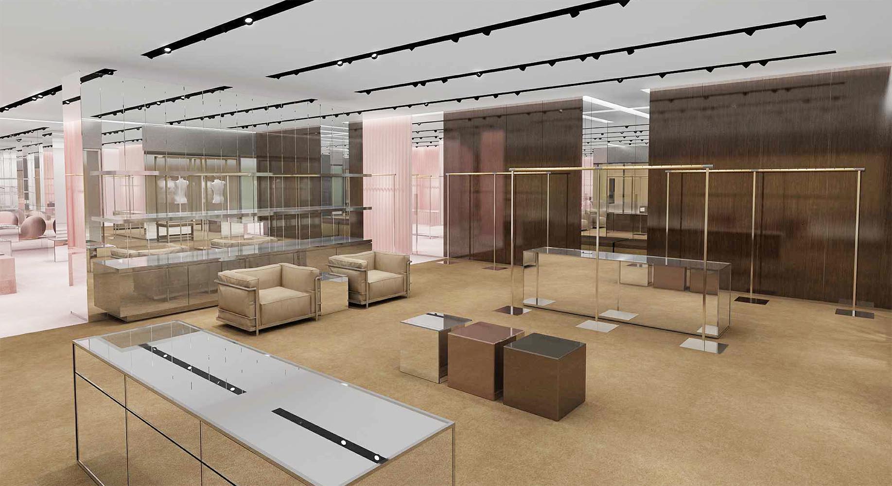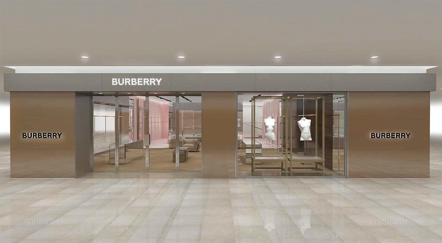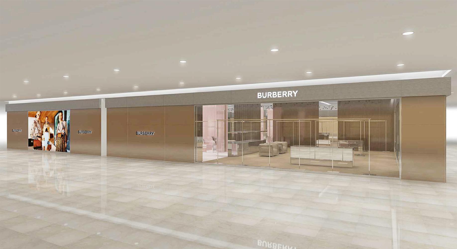The main entry way and central display is conceptualized as an ever-changing gallery environment for which to display Burberry’s latest collections, with a standalone square-frame unit for merchandising.
