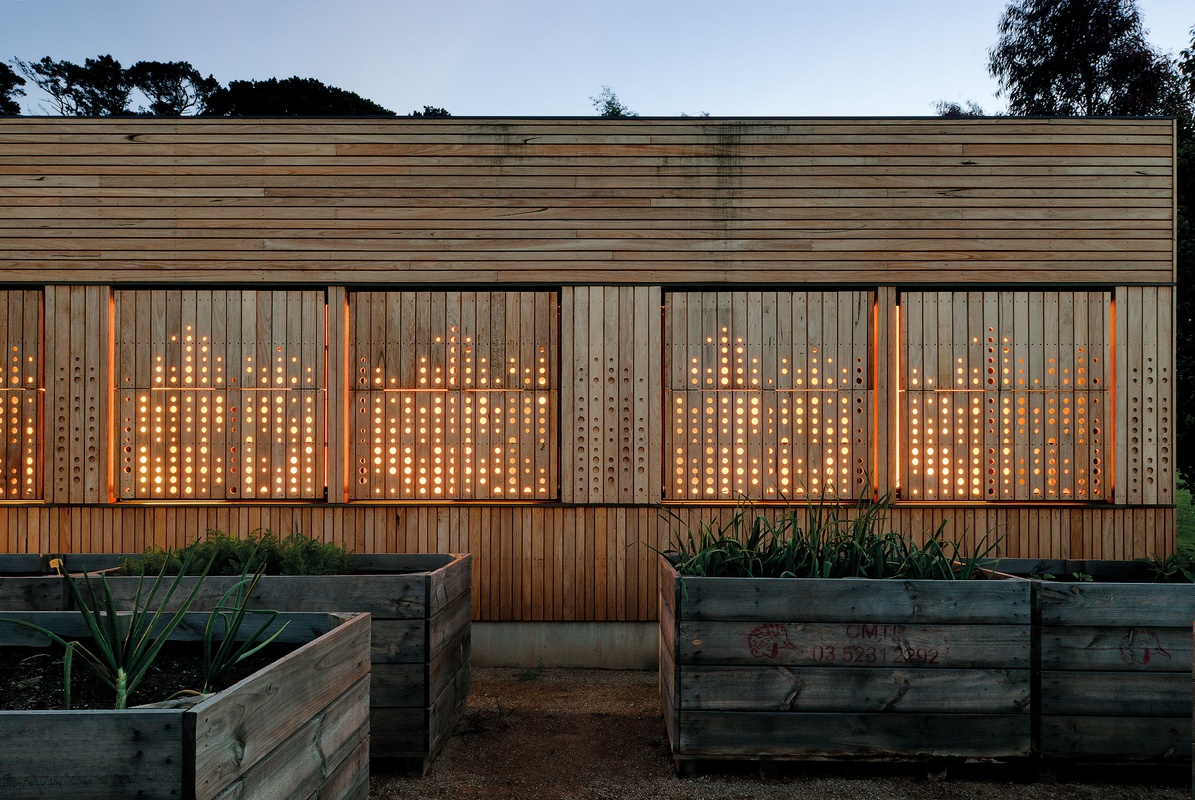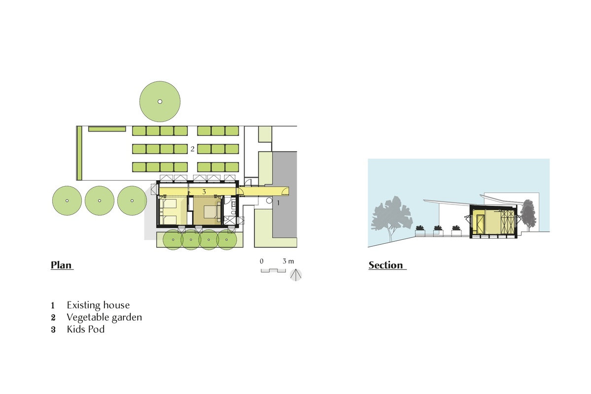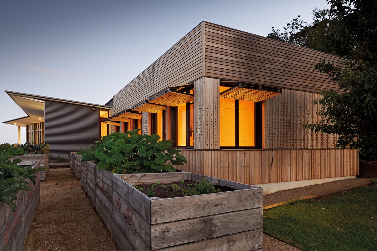 The veggie patch was reinstated and tripled in size at the north, with a series of elevated, ergonomic, raised timber crates that look somewhat like the extension’s own little brood. Connected to the existing house by a narrow glazed walkway, the new spaces consist of one bathroom and two bedrooms, lined meticulously in plywood and linked by a fantastic segment of un-programmed space that captures the northern light and provides an area for kids to spread out or perch on the simple, robust plywood seating for some quiet reading.